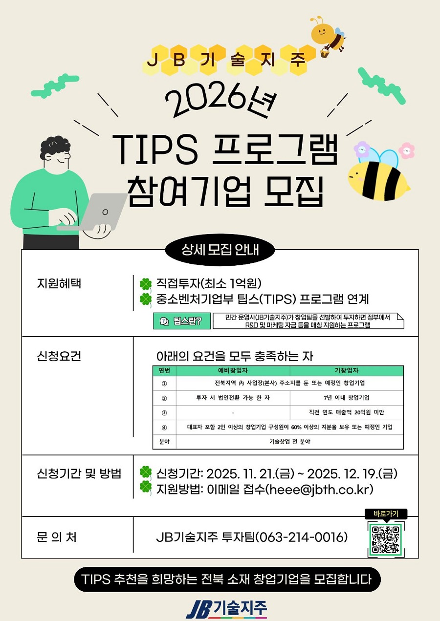* 사 업 명: 2026년 JB기술지주 팁스(TIPS) 프로그램 '꿀-팁스'