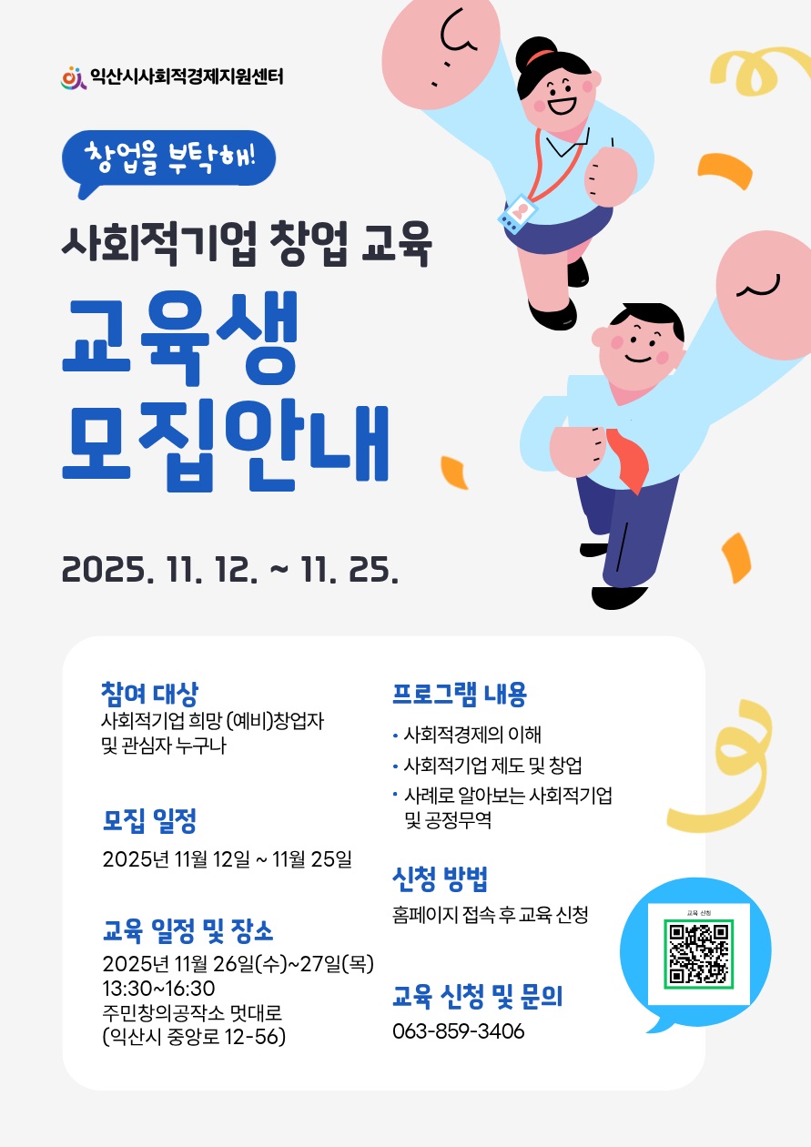 2025년 하반기 사회적기업 창업 아카데미 □ 일 시 : 2025. 11. 26.(수) ~ 11. 27.(목) 13:30~16:30(총 6H) □ 장 소 : 주민창의공작소 멋대로(익산시 중앙로 12-56) □ 대 상 : 사회적기업 희망 (예비)창업자, 익산 시민 등 □ 내 용 : 사회적경제 이해 및 사회적기업 우수사례(공정무역) 소개 □ 모집개요 - 모집기간 : 2025. 11. 12.(수) ~ 11. 25.(화) (2주간) - 모집인원 : 총 20명 내외(2일간) - 신청방법 : 익산시 사회적경제지원센터 홈페이지 신청(www.ikse.or.kr) 또는 전화접수(☏063-859-3406) |