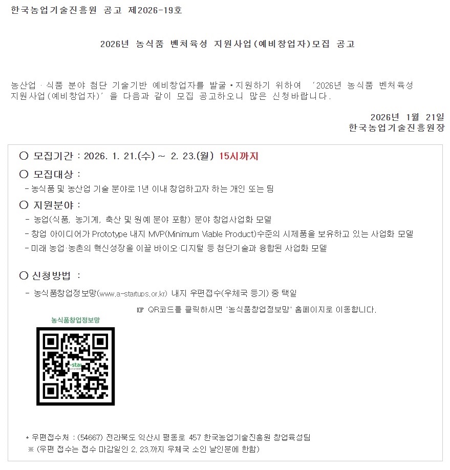 2026년 농식품 벤처육성 지원사업(예비창업자) 모집 공고