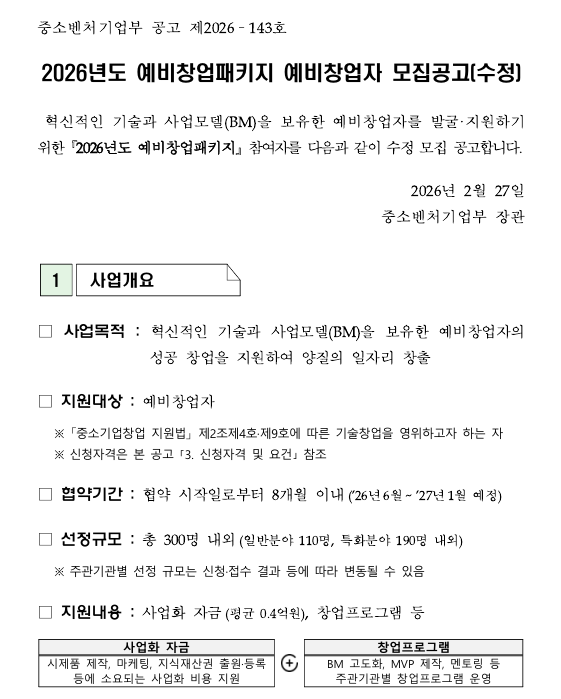 ![]() [신청방법 및 대상] 신청기간: 2026. 03. 06(금) 00:00 ~ 2026. 03. 24(화) 16:00까지 신청방법: K-Startup 누리집 온라인 신청(www.k-startup.go.kr) 신청대상: 신청자 명의의 사업자등록증을 보유하고 있지 않으며, 법인의 법률상 대표권을 가지고 있지 않은 자 (기준일 : '26.1.22.) ※ 자격 예외 요건 등 상세 내용은 공고문 참조 제외대상: 공고문 신청 제외 대상 참조 신청 시 요청하는 정보(개인정보포함)는 사업운영기관에서 관리되오니 이점 반드시 유의하여 주시기 바랍니다. [제출서류] 사업계획서, 기타 제출서류 각 1부 - 업로드 파일은 30MB 이하로 하며, 가점 증빙 누락 시 불인정 - 제출하신 서류는 반환되지 않습니다. 제출하신 서류는 사업운영기관에서 관리되오니 서류 반환 등 문의는 해당 기관으로 하시기 바랍니다. [선정절차 및 평가방법] 총 3단계 평가 (서류평가 → 인큐베이팅 → 발표평가) - 서류평가 : 사업계획서 서면평가(2배수 내외 선정) - 인큐베이팅 : BM 구체화 교육 및 멘토링 등을 통한 역량 검증(서류평가 통과자 대상) - 발표평가 : 발표 및 질의응답(서류평가 통과자 대상, 30분 이내) [지원내용] 창업사업화에 소요되는 자금 평균 0.4억원, 창업프로그램 등 ※ 사업화 자금(정부지원사업비)을 사업단계별(총 2단계)로 차등 지원(상세내용은 [별첨4] 참조) - 1단계 : BM 구체화를 위한 시장조사 및 최소기능 제품(MVP) 제작 등 사업화 준비 자금 지원(20백만원) - 2단계 : 협약 중간 시점에 1단계 사업계획의 진척도 및 향후 추진계획 등을 평가 평가 결과에 따라 50% 내외 선정하여 추가 정부지원사업비 지원 [문의처] 시스템 및 사업 문의 - 신청·접수 시스템(K-Startup) 문의 : 국번없이 1357 - 사업관련 문의 : 공고문 내 주관기관 연락처 참고(063-220-8943/8960) 자세한 내용은 첨부파일 참조 및 문의처로 문의하여 주시기 바랍니다. |
