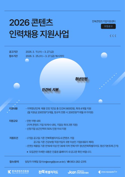 ▼▼공고 바로가기▼▼ 알림마당 > 공지사항-상세화면 > [공고 제2026-05호] 2026 콘텐츠 인력채용 지원사업 모집공고 : 전북특별자치도 콘텐츠융합진흥원 |