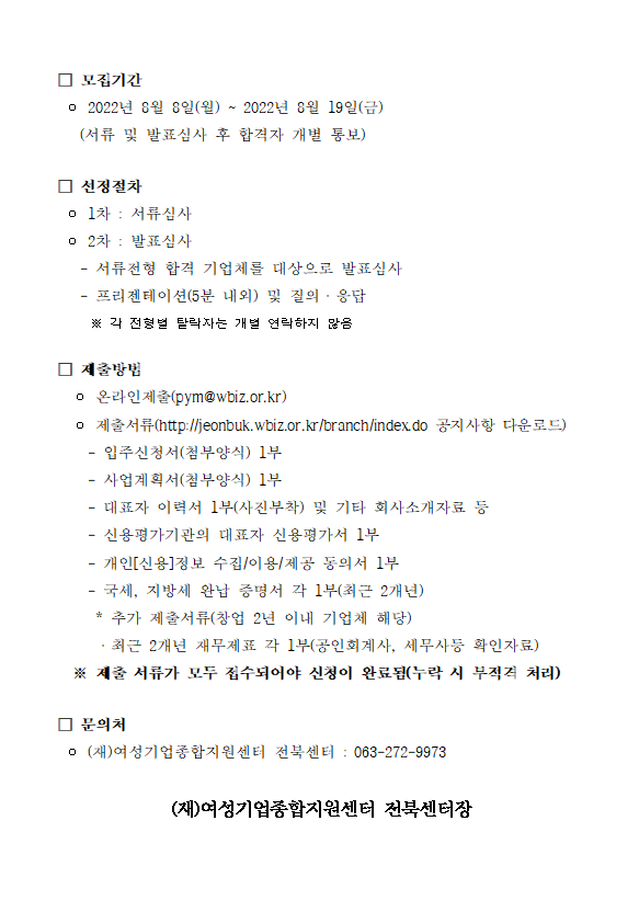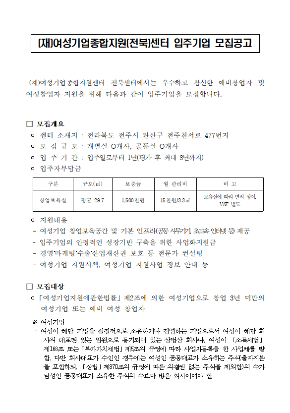 (재)여성기업종합지원센터 전북센터 입주기업 모집