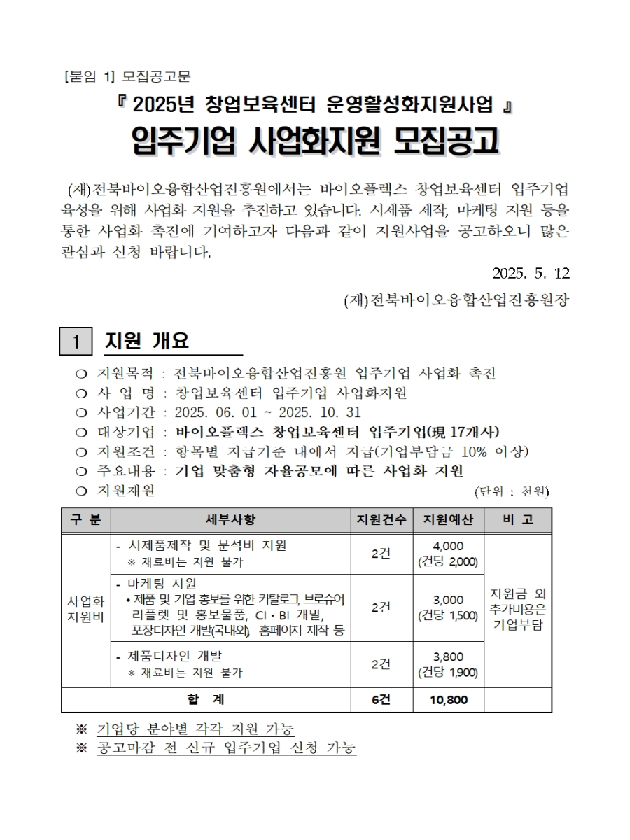 2025년 창업보육센터 운영활성화지원사업 바이오플렉스 창업보육센터 입주기업 사업화지원 공고