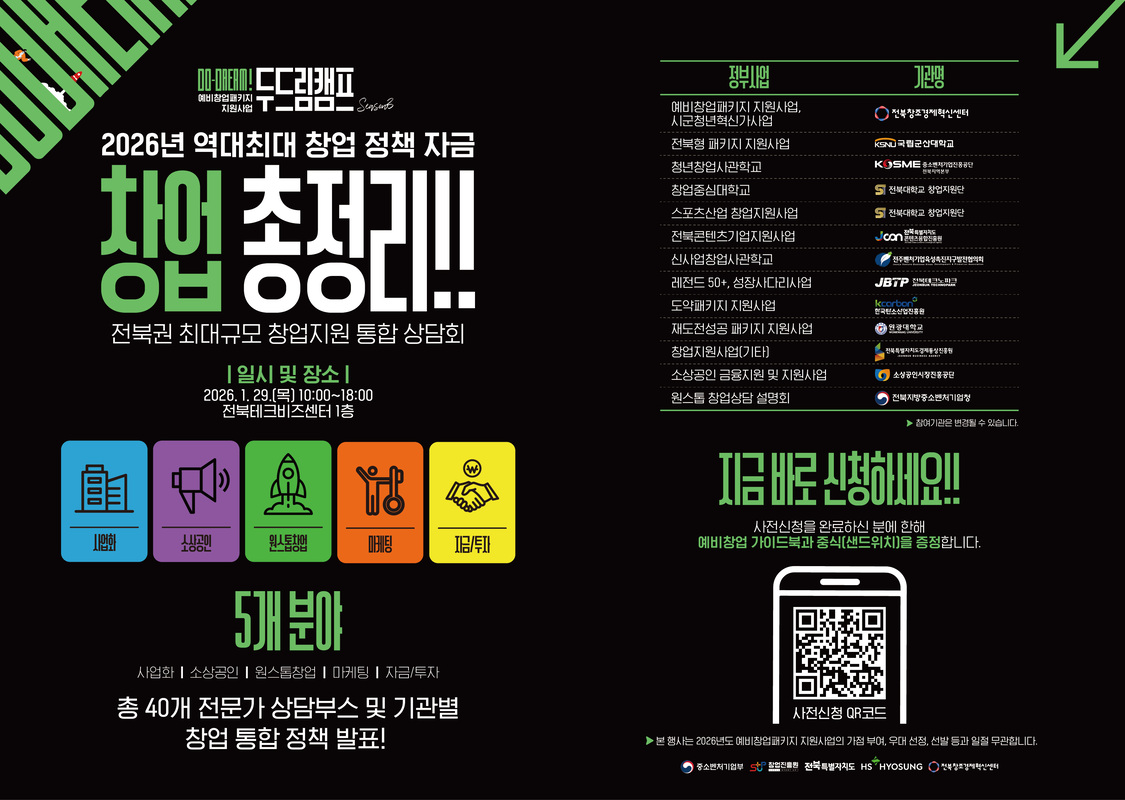 ![]() ☞ 2026 예비창업패키지 도전자를 위한 찬스!☜ *예비창업패키지 두드림 캠프* ㆍ일시: 2026. 1. 29.(목) 10:00~18:00 ㆍ장소: 전북테크비즈센터(전북 전주시 덕진구 오공로 123) ㆍ참석대상: 예비창업자·창업 관심자 누구나 ㆍ주요내용 ☞ 창업정책 설명회 ☞ One-Stop 창업상담 ☞ 1:1 전문가 컨설팅 ☞ 사전신청: https://link24.kr/58Tgo5c (사전신청자에 한하여 가이드북 & 샌드위치 증정) |