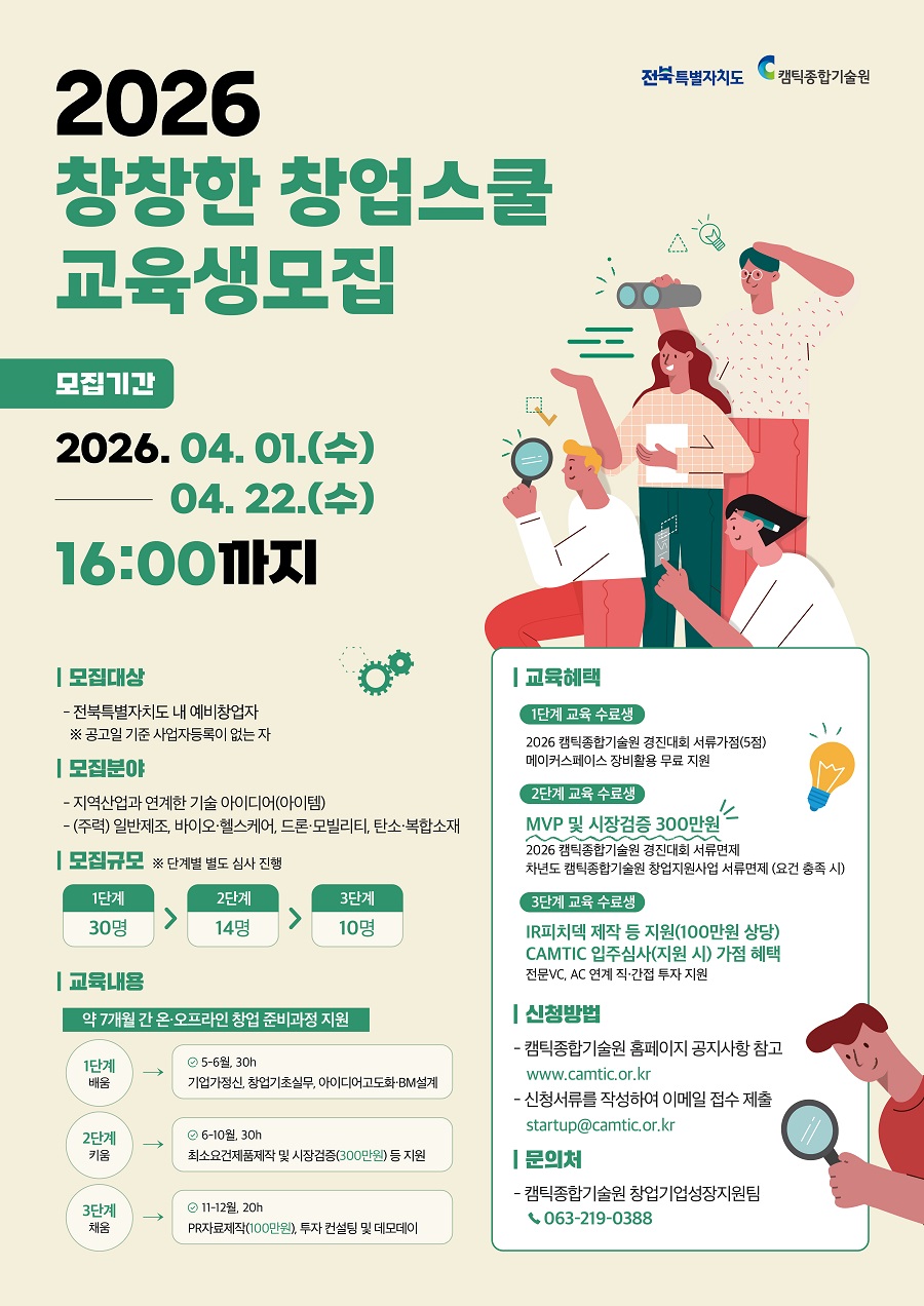 2026년 창창한 창업스쿨 교육생 모집• 모집기간 2026. 4. 1.(수) ~4. 22.(수) 16:00까지 • 모집대상 - 전북특별자치도 내 예비창업자 ※공고일 기준 사업자등록이 없는 자 • 모집분야 - 지역산업과 연계한 기술 아이디어(아이템) - (주력) 일반제조, 바이오·헬스케어, 드론·모빌리티, 탄소·복합소재 • 모집규모 - (1단계) 30명, (2단계) 14명, (3단계) 10명 *단계별 별도 심사 진행 • 교육내용 - 약 7개월 간 온·오프라인 창업 준비과정 지원 - 1단계 배움 : 5-6월, 30h, 기업가정신, 창업기초실무, 아이디어고도화·BM설계 - 2단계 키움 : 6-10월, 30h, 최소요건제품제작 및 시장검증(300만원)등 지원 - 3단계 채움 : 11-12월,20h, PR자료제작(100만원), 투자 컨설팅 및 데모데이 • 교육혜택 - 1단계 교육 수료생 : 2025 캠틱종합기술원 경진대회 서류가점(5점), 메이커스페이스 장비활용 무료 지원 - 2단계 교육 수료생 : MVP 및 시장검증 300만원, 캠틱 경진대회 서류면제, 차년도 캠틱 창업지원사업 서류면제(요건 충족 시) - 3단계 교육 수료생 : IR피치덱 제작 등 지원(100만원 상당), CAMTIC 입주심사(지원 시) 가점 혜택, 직·간접 투자 지원 • 신청방법 - 캠틱종합기술원 홈페이지 공지사항 참고(www.camtic.or.kr) - 신청서류를 작성하여 이메일 접수 제출(startup@camtic.or.kr) - 문의처 : 캠틱종합기술원 창업기업성장지원팀 Tel.063-219-0388 ※ 자세한 내용은 공고문 참조 |