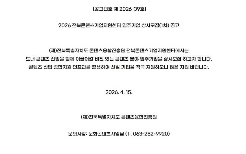 2026년 전북콘텐츠기업지원센터 입주기업 모집공고