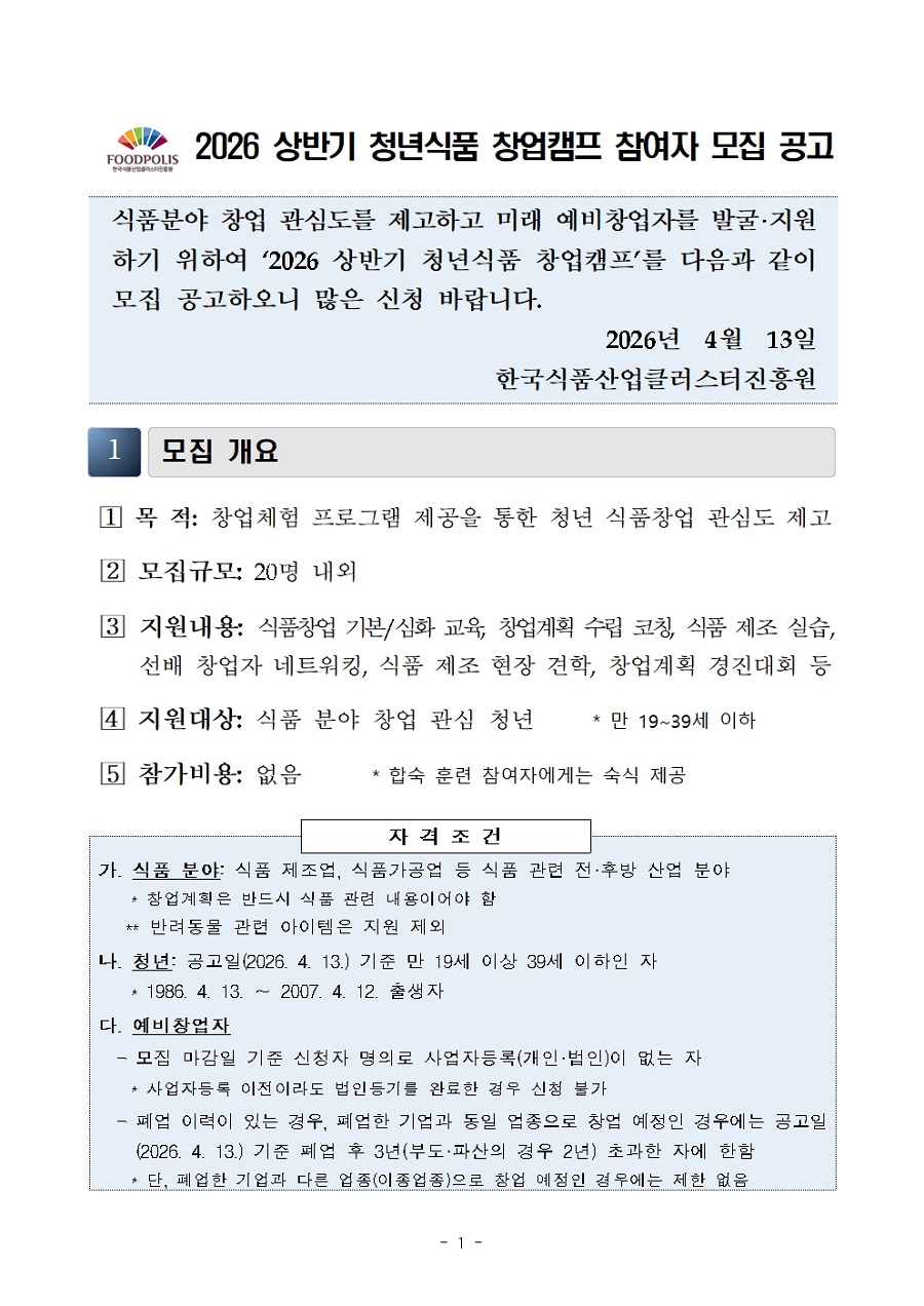 2026 상반기 청년식품 창업캠프 참여자 모집 공고